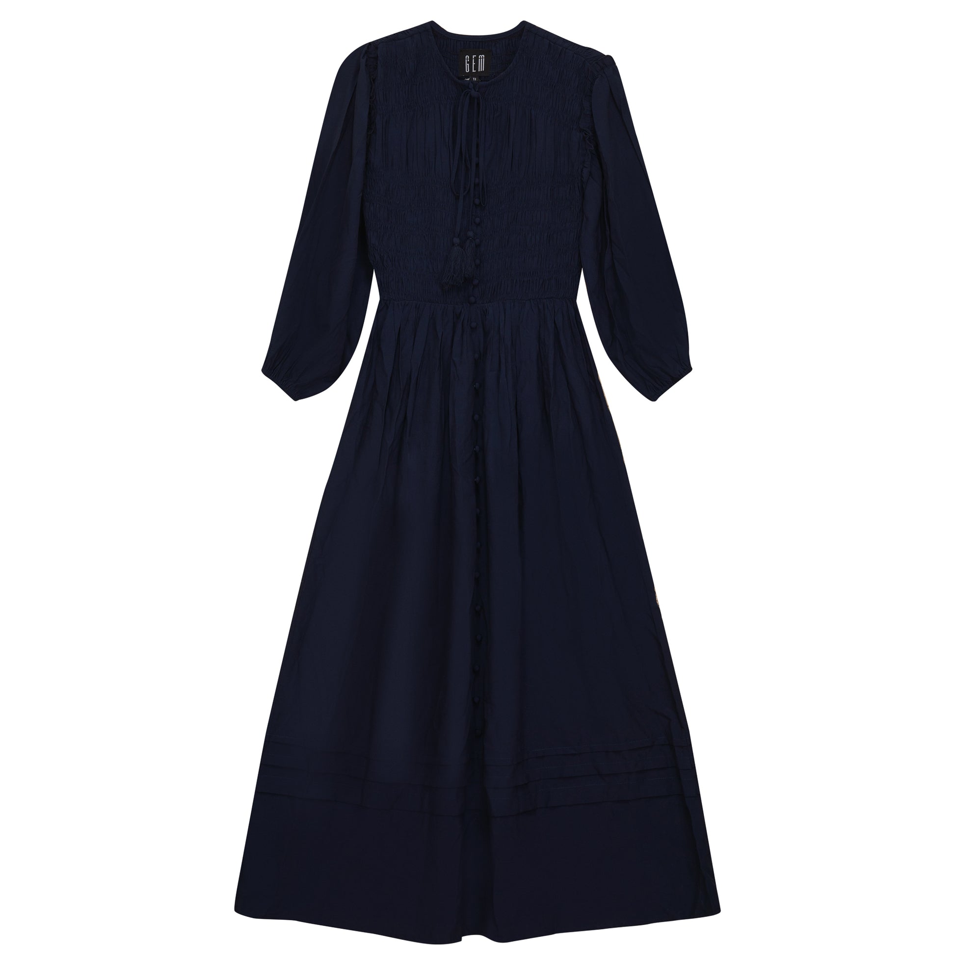 This smocked button-down maxi dress exudes stunning elegance with its delicate detailing and tailored silhouette. Its refined design offers a graceful and sophisticated look, perfect for making a memorable impression.